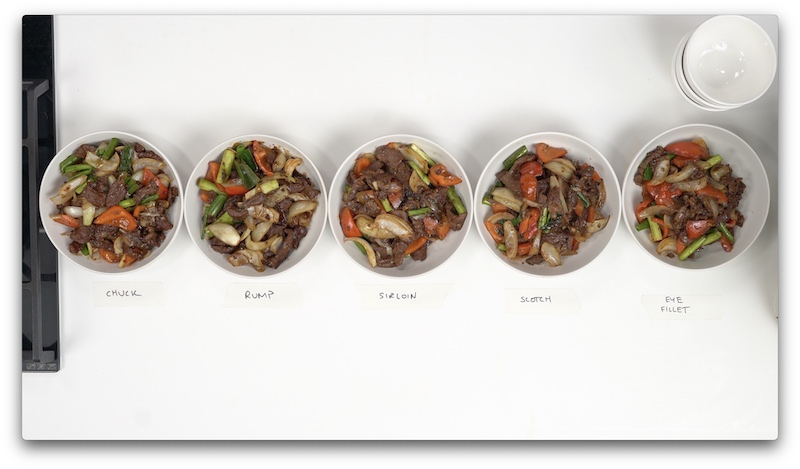 I chose five different beef cuts – chuck, rump, sirloin, scotch and eye fillet – that were widely available in my local supermarket and used them all in a classic super-tender beef stir-fry recipe of mine.